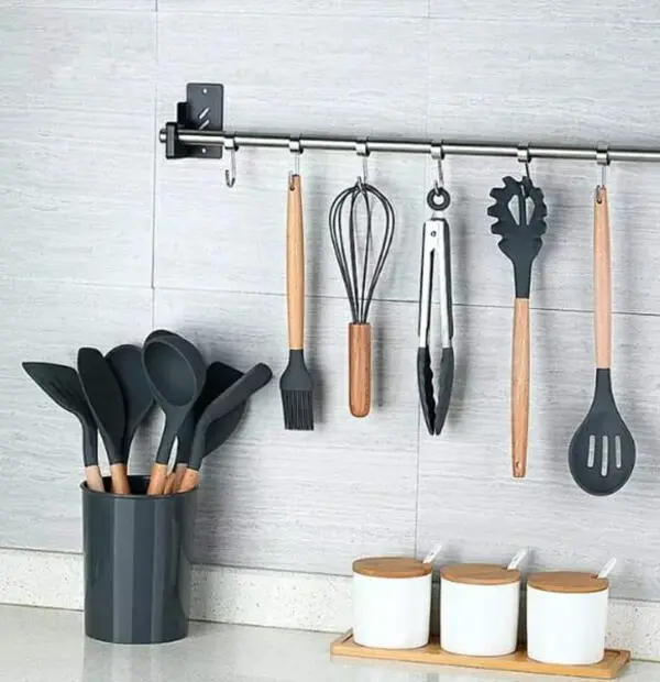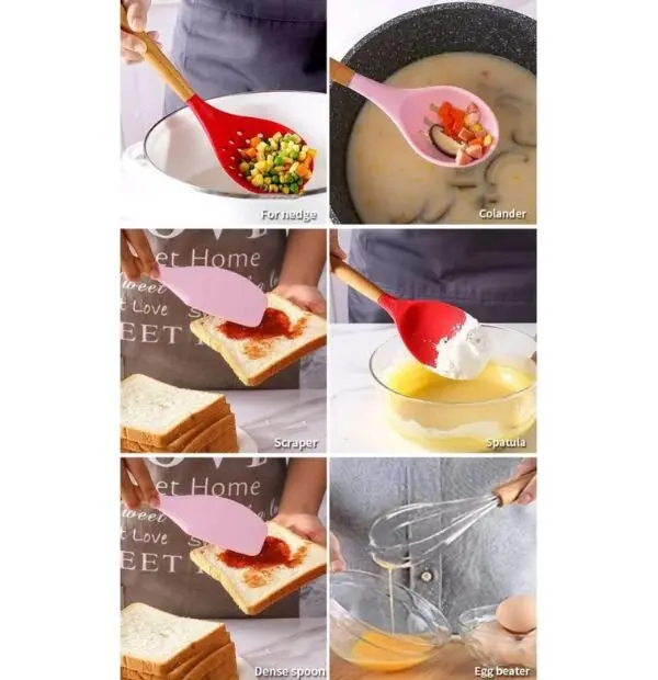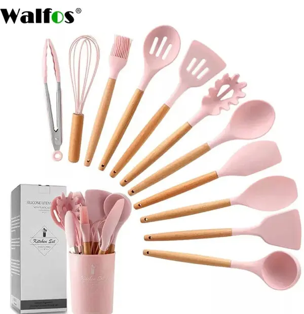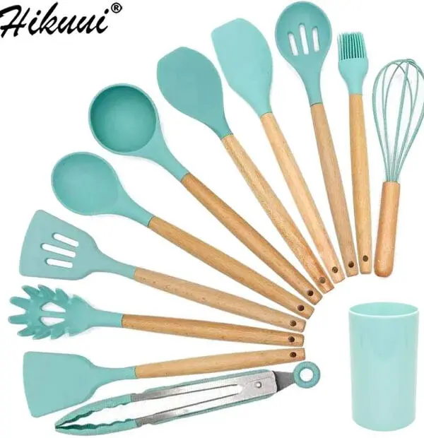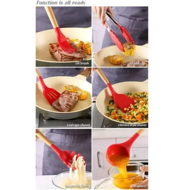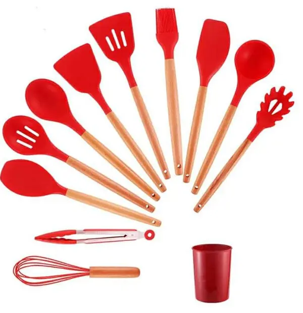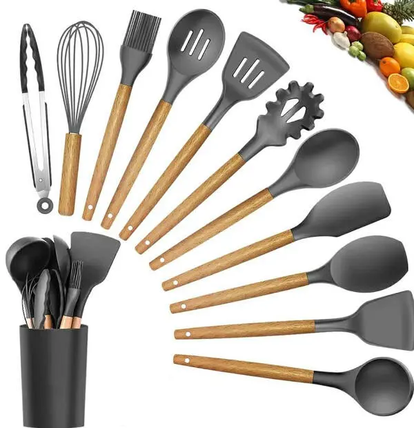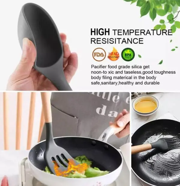 Wooden Handle Silicone Kitchen Spoon Set with Holder